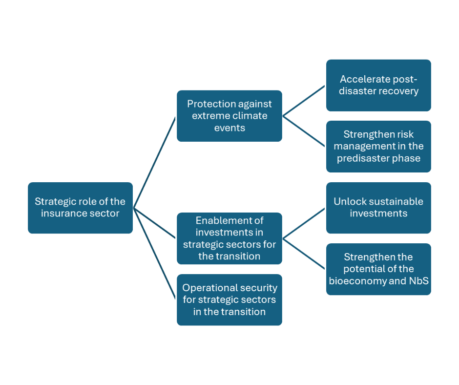 These impacts also affect existing insurance products that cover climate-related risks, such as property insurance and agricultural insurance. Thus, insurance can serve beyond a post-disaster response. It can also play a proactive role in providing security for structural reforms. Many sectors are both exceptionally vulnerable to climate change and essential to a successful transition, such as agriculture or and infrastructure. Risk-transfer mechanisms must go beyond traditional approaches. The insurance sector can shift the financial burden of climate-induced damage from policyholders to insurers. Simultaneously, it can incentivize policyholders to adopt risk-reduction strategies.